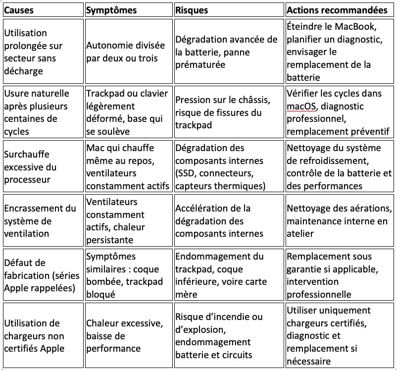 De nombreux utilisateurs découvrent un jour que leur trackpad ne clique plus, que le châssis se déforme, ou que le clavier se soulève.