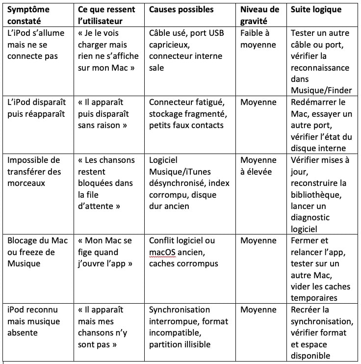 Votre iPod fonctionne encore, l’écran s’allume, la molette répond, la musique défile comme avant. Bref, a priori tout va bien. Et pourtant, au moment de le brancher à l’ordinateur, quelque chose cloche. iTunes hésite, l’iPod apparaît puis disparaît, ou un message laconique s’affiche avant de tout bloquer.