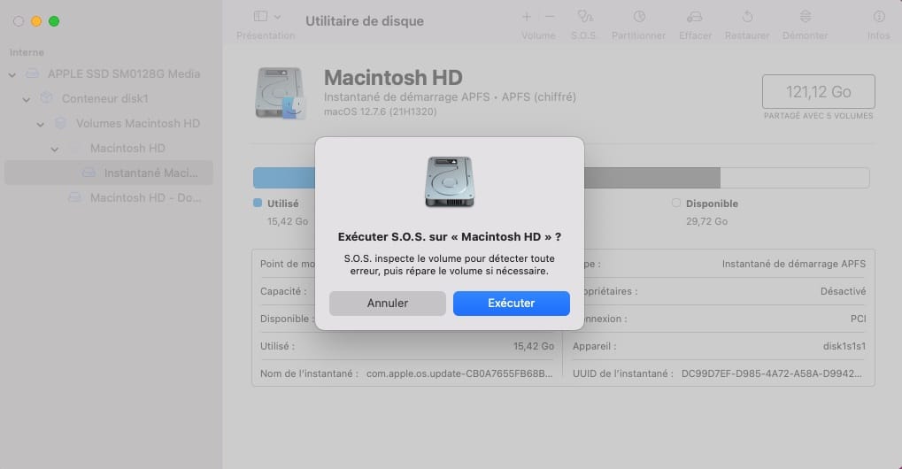 - Sélectionnez votre disque principal (généralement « Macintosh HD ») et cliquez sur SOS -> Exécuter.