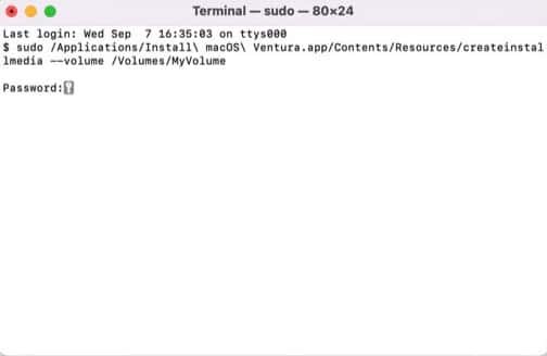 sudo /Applications/Install\ macOS\ [version].app/Contents/Resources/createinstallmedia –volume /Volumes/MyVolume