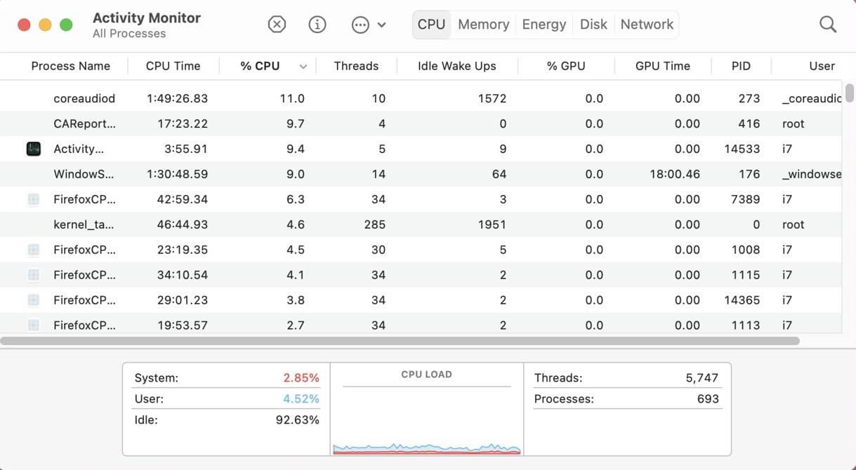 Dans Moniteur d’activité, cliquez sur l’onglet % CPU pour classer les processus du plus gourmand au moins gourmand. Si un processus utilise 80 à 100 % du processeur en continu, vous avez probablement identifié l’origine de la chauffe.