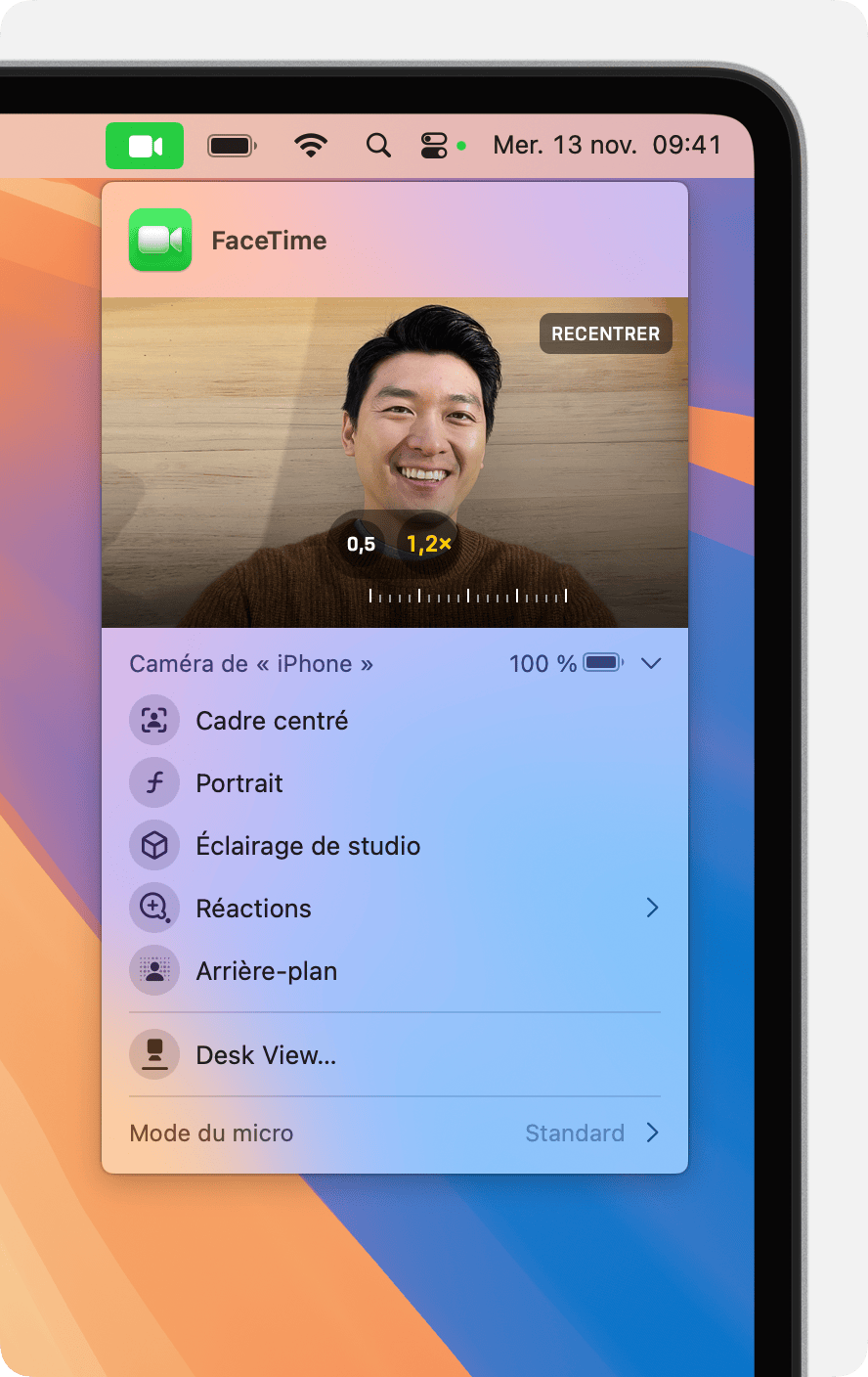 - Activez Desk View depuis le menu vidéo ou le Centre de contrôle selon votre version macOS.