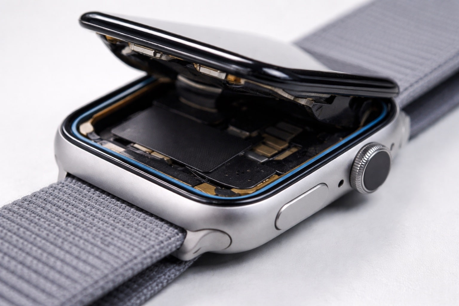 L’écran d’une Apple Watch n’est pas simplement clipsé : il est maintenu par une fine bande adhésive qui fait aussi office de joint d’étanchéité. Cette bande assure à la fois la fixation de l’écran et la protection contre l’humidité.
