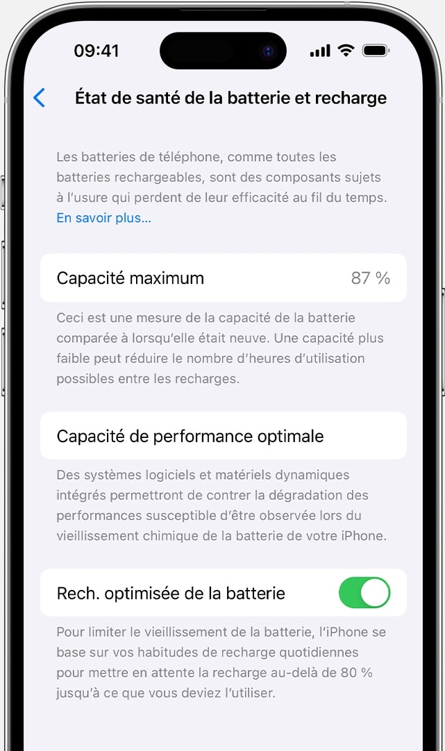 Allez dans « Réglages » -> « Batterie » -> « État de santé de la batterie et recharge » :