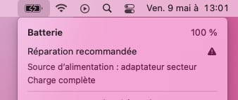 - Observez également les mentions sur votre batterie, en cliquant sur l’icône « batterie » en haut à droite de votre écran (rectangle avec éclair), vous pouvez voir 2 types de mentions : « Normal » et « Réparation recommandée ».