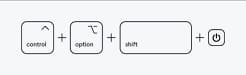 - Maintenez enfoncées les touches « Maj » + « Control » + « Option » (sur la partie gauche du clavier) + le bouton d’alimentation en même temps pendant 10 secondes.